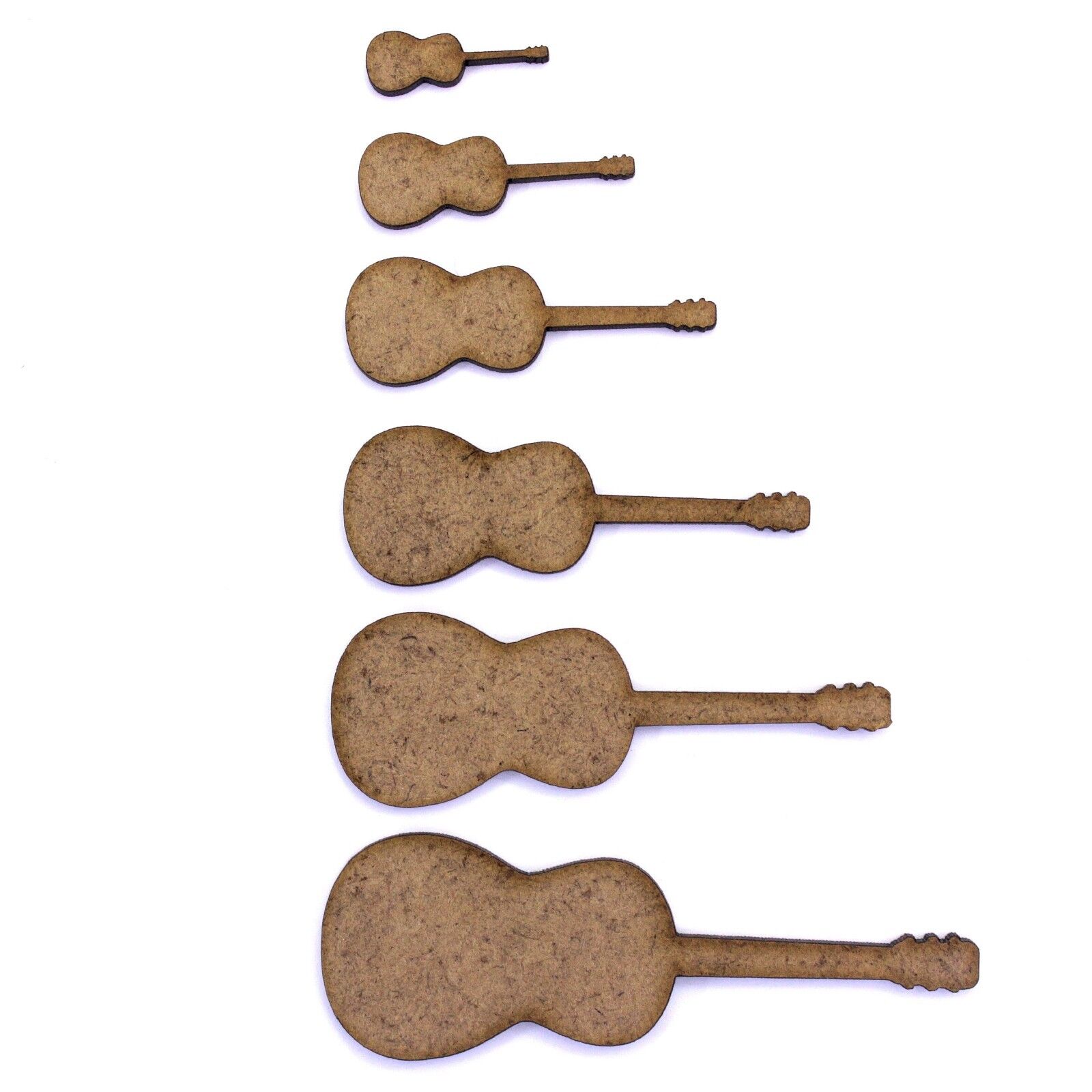 These 2mm thick MDF acoustic guitar shapes are available in the following sizes: 20mm, 30mm, 40mm, 50mm, 60mm, 70mm, 80mm, 90mm, 100mm, 150mm, 200mm They are laser cut from premium 2mm thick MDF These embellishments can be used in craft projects, making decorations, gift tags, cards, decoupage etc. They would be perfect for creating wedding or anniversary cards, gifts and decorations. They can be painted and glued into place (some light roughing of the surface with sandpaper may be required depending on medium being used). Being laser cut, they do have some small laser burn marks, though these can be painted over or sanded out if required.