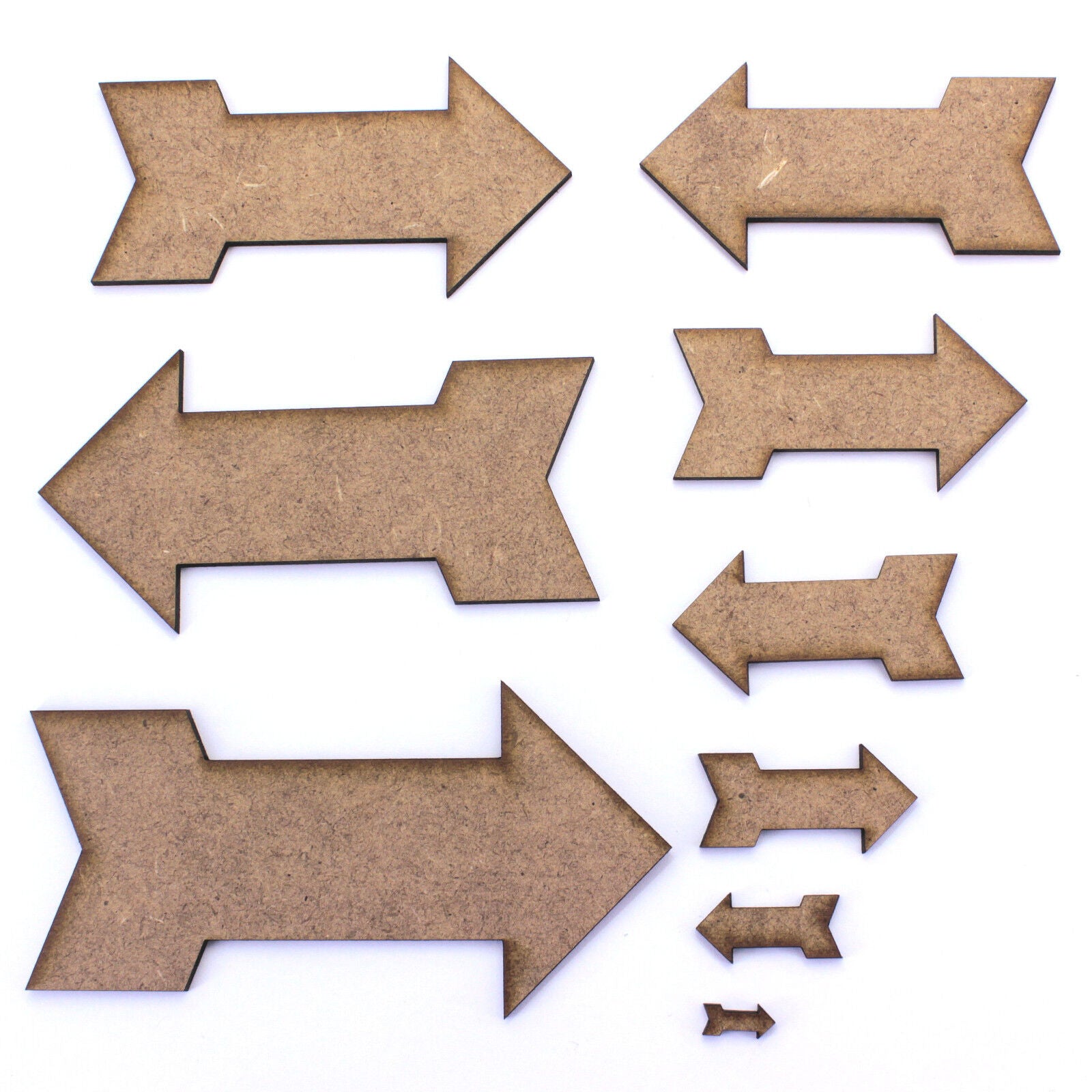 These 2mm thick MDF arrows are available in the following sizes: 10mm, 20mm, 30mm, 40mm, 50mm, 60mm, 70mm, 80mm, 90mm, 100mm, 150mm, 200mm They are laser cut from premium 2mm thick MDF These embellishments can be used in craft projects, making decorations, gift tags, cards, decoupage etc. They can be painted and glued into place (some light roughing of the surface with sandpaper may be required depending on medium being used).