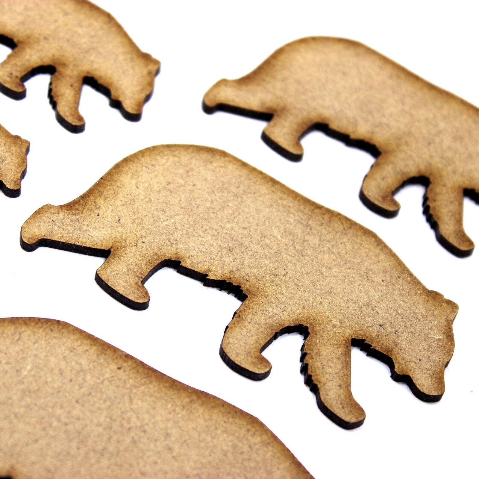 These 2mm thick MDF Black Bear shapes are available in the following sizes: 30mm, 40mm, 50mm, 60mm, 70mm, 80mm, 90mm, 100mm, 150mm, 200mm They are laser cut from premium 2mm thick MDF These embellishments can be used in craft projects, making decorations, gift tags, cards, decoupage etc. They would be perfect for creating wedding or anniversary cards, gifts and decorations. They can be painted and glued into place (some light roughing of the surface with sandpaper may be required depending on medium being used). Being laser cut, they do have some small laser burn marks, though these can be painted over or sanded out if required.