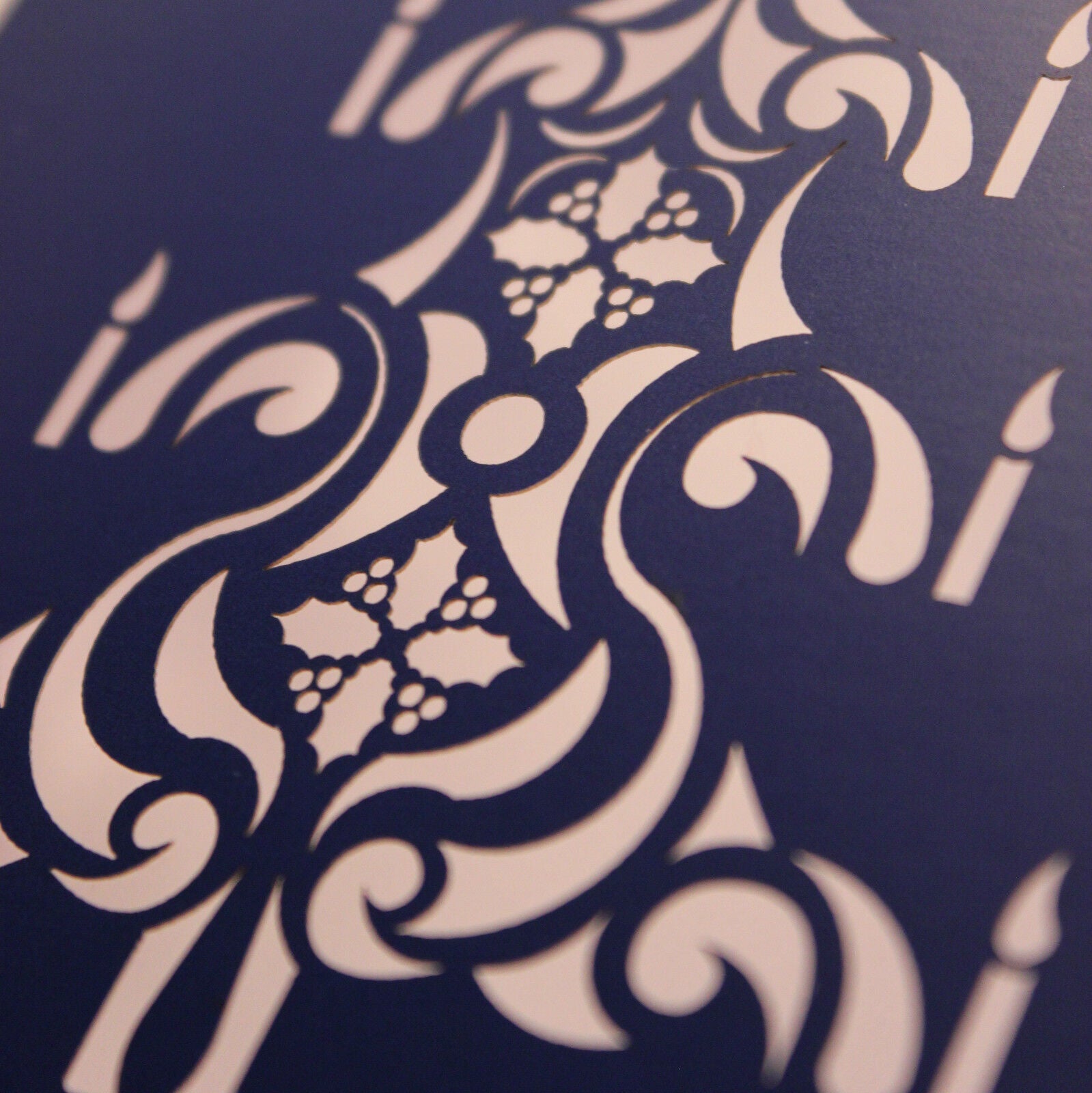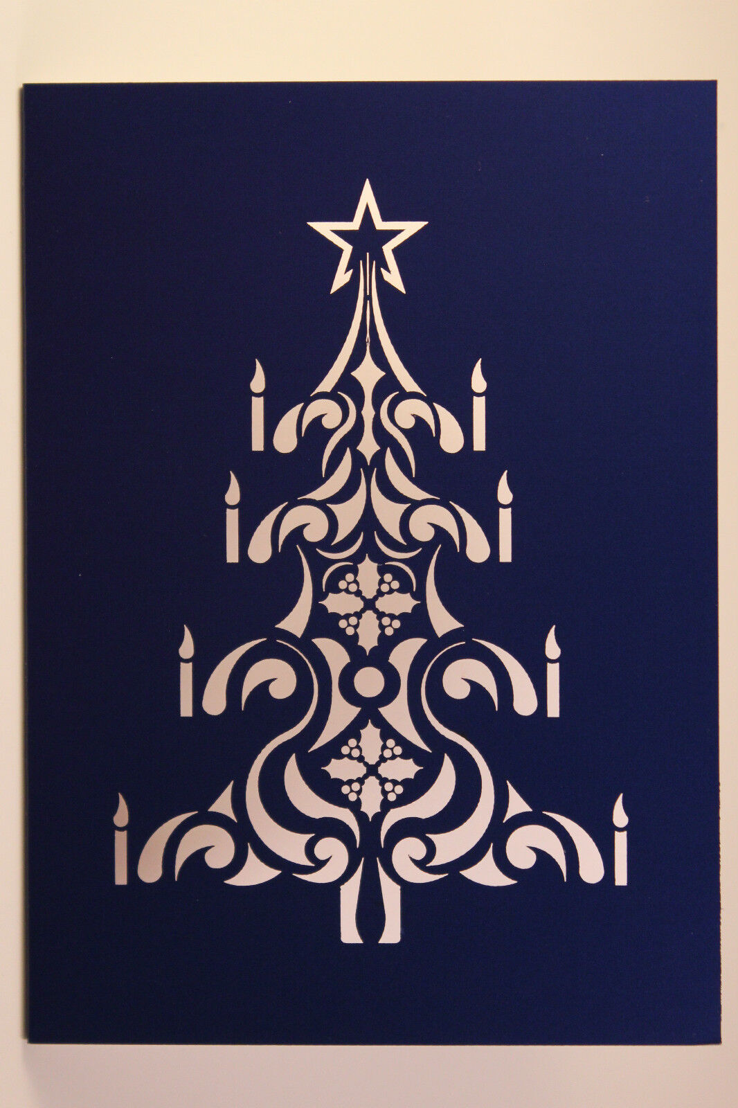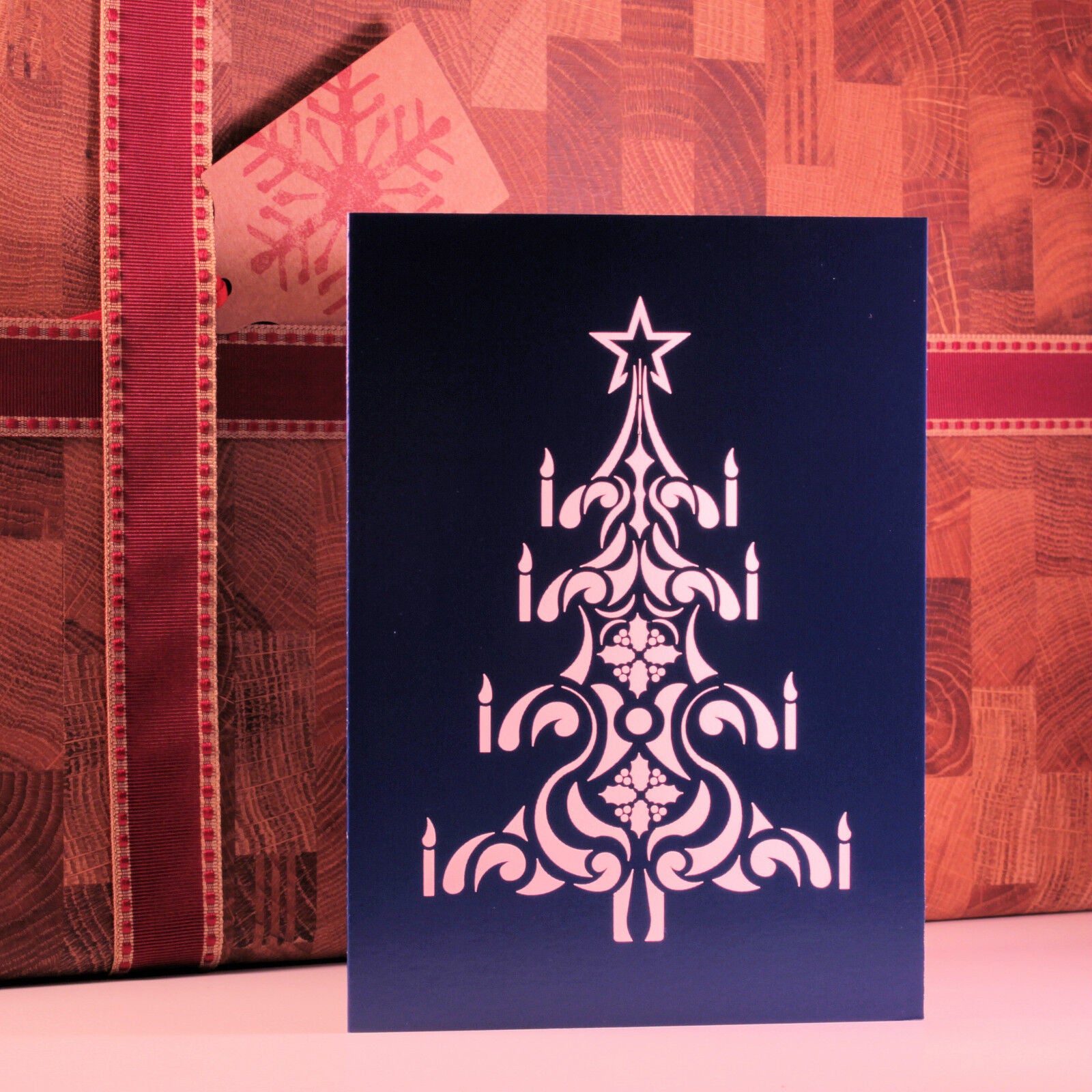 These A6 cards have an elegant Christmas tree design laser cut into blue 350gsm cardstock. A white paper insert is left blank for your own message. Each card is supplied with a white envelope.