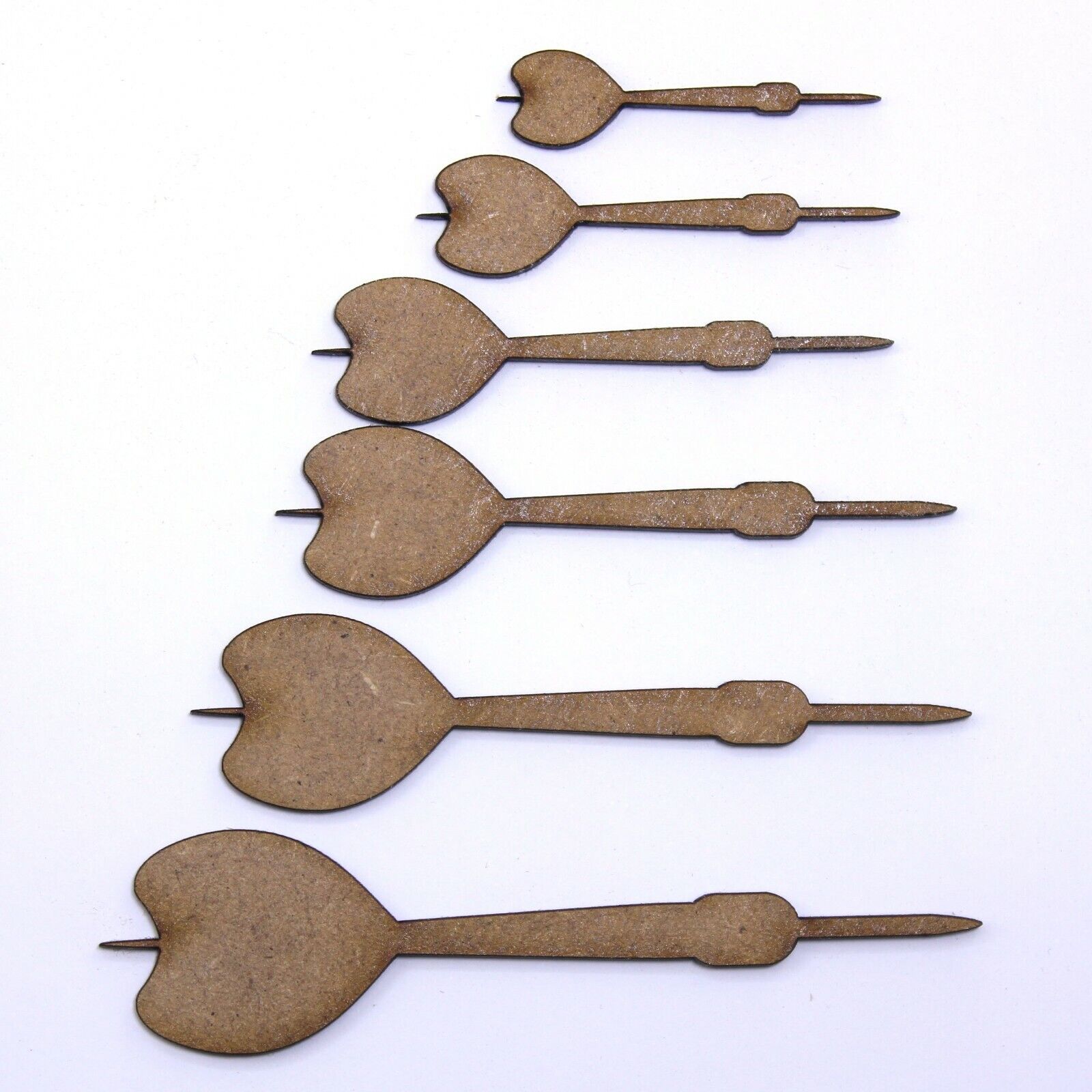 These 2mm thick MDF Dart shapes are available in the following sizes: 50mm, 60mm, 70mm, 80mm, 90mm, 100mm, 150mm, 200mm They are laser cut from premium 2mm thick MDF These embellishments can be used in craft projects, making decorations, gift tags, cards, decoupage etc. They would be perfect for creating birthday, wedding or anniversary cards, gifts and decorations. They can be painted and glued into place (some light roughing of the surface with sandpaper may be required depending on medium being used). Being laser cut, they do have some small laser burn marks, though these can be painted over or sanded out if required.