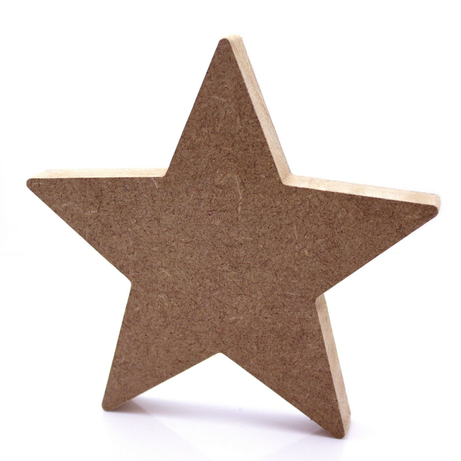 These 18mm thick MDF Star shapes are available in the following sizes: 150mm, 200mm, 250mm, and 300mm They are cut from premium 18mm thick MDF using a rotary CNC Tool. These shapes could be used to make decorations and gifts. They are supplied unfinished, so they can be easily painted (sandpaper may be required to prepare the surface depending on medium being used).