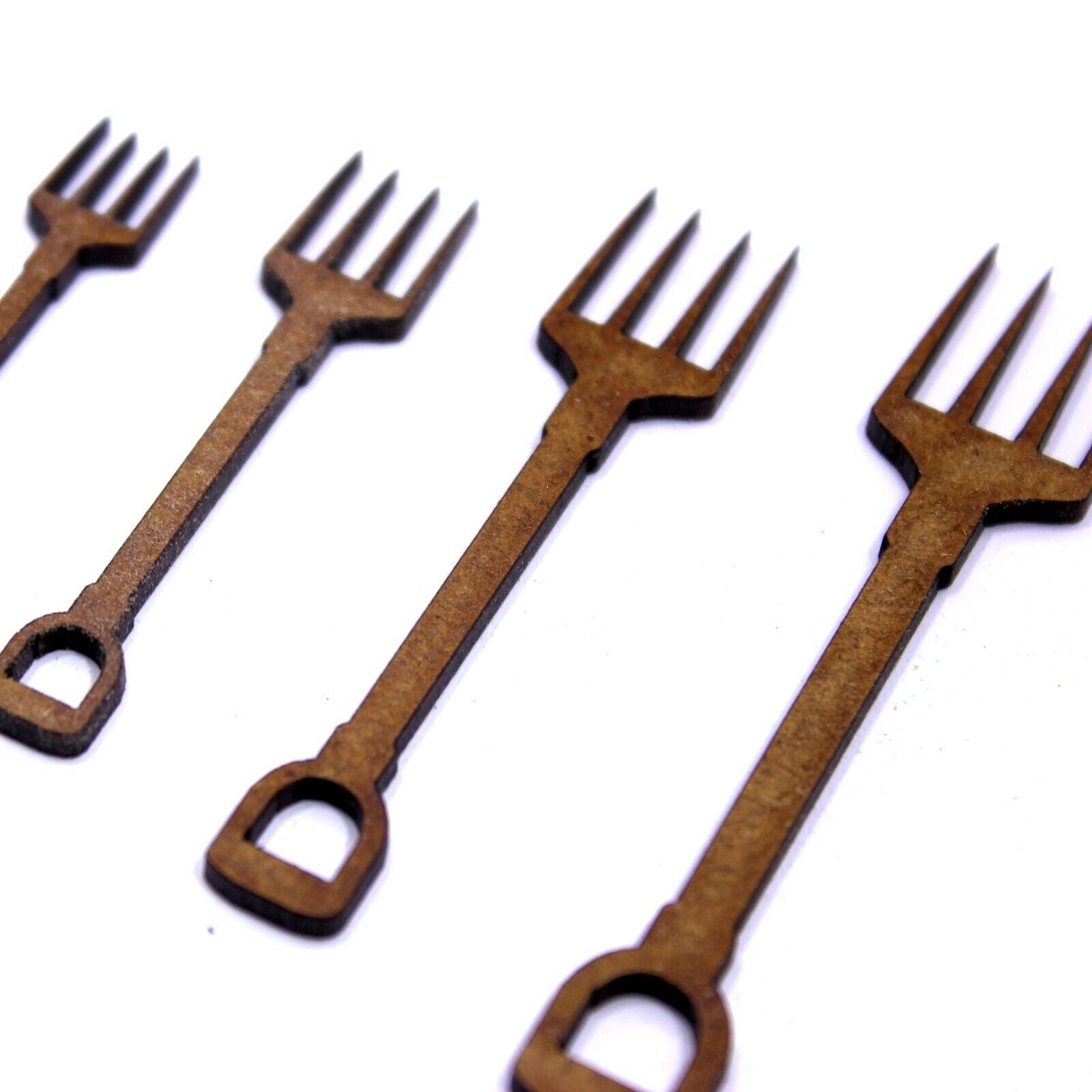These 2mm thick MDF Garden Fork shapes are available in the following sizes: 40mm, 50mm, 60mm, 70mm, 80mm, 90mm, 100mm, 150mm, 200mm They are laser cut from premium 2mm thick MDF These embellishments can be used in craft projects, making decorations, gift tags, cards, decoupage etc. They would be perfect for creating wedding or anniversary cards, gifts and decorations. They can be painted and glued into place (some light roughing of the surface with sandpaper may be required depending on medium being used). Being laser cut, they do have some small laser burn marks, though these can be painted over or sanded out if required.