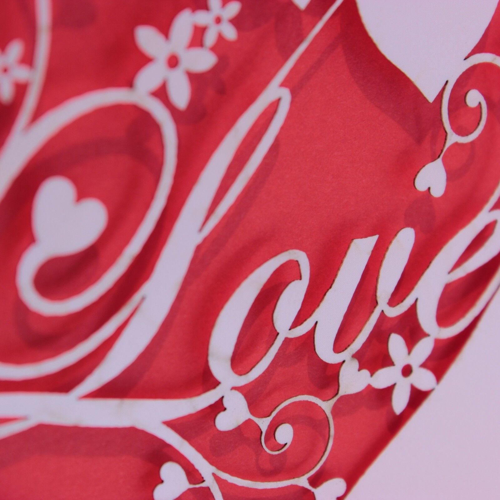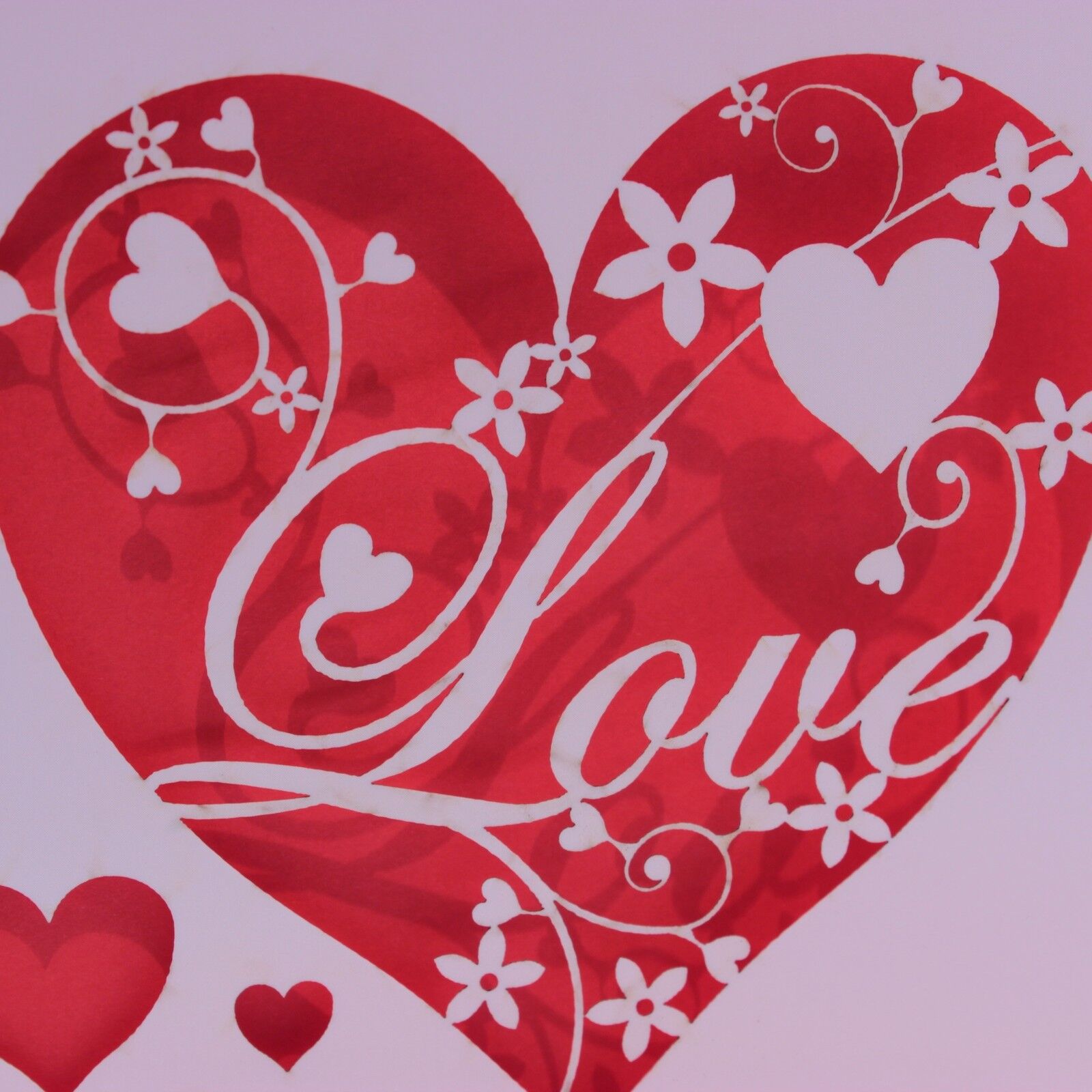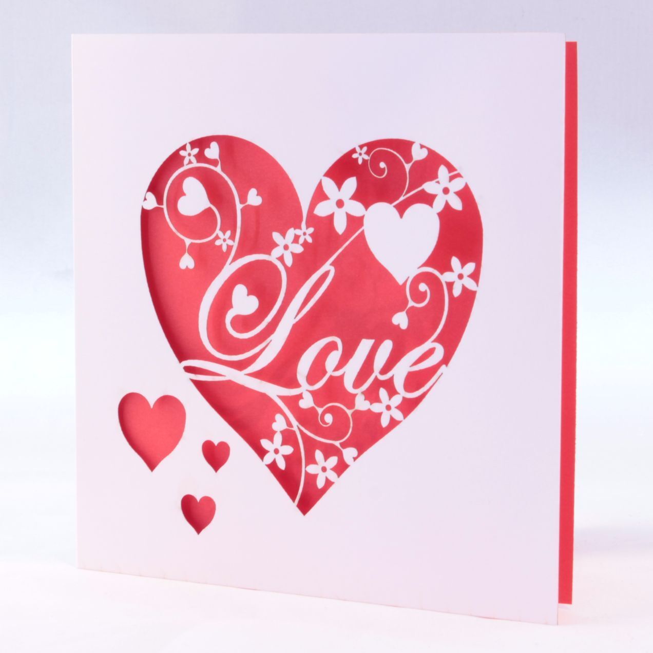 These cards are made from pink card which has been laser cut with a heart design on the front with the word 'Love' in the centre. The red insert is left blank for your own message. Each card is supplied with a red envelope. Each card measure 125mm x 125mm .
