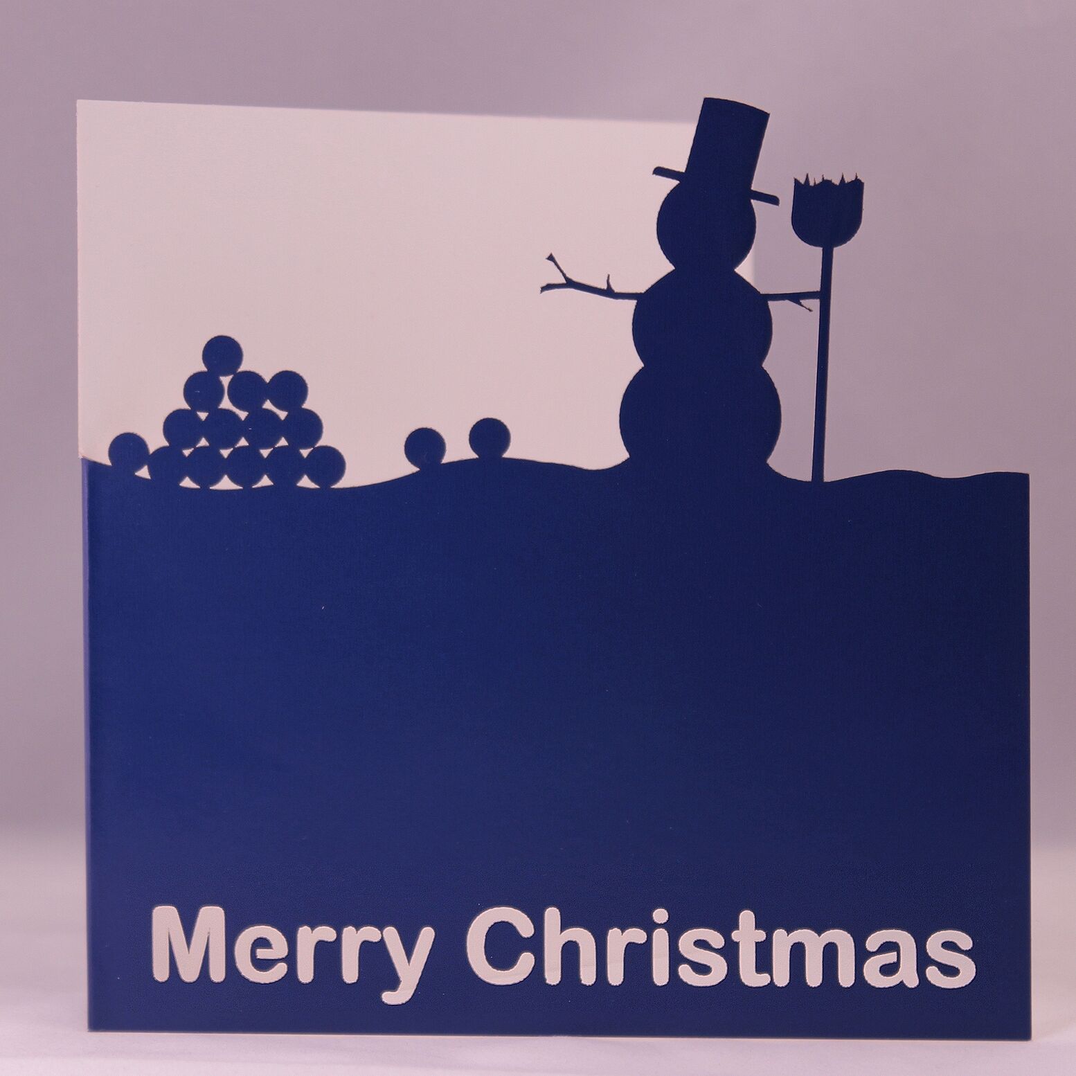 These cards have a snowman silhouette laser cut out of blue 350gsm cardstock. The inside is left blank for your own message. Each card is supplied with a white envelope. Each card measure 125mm x 125mm