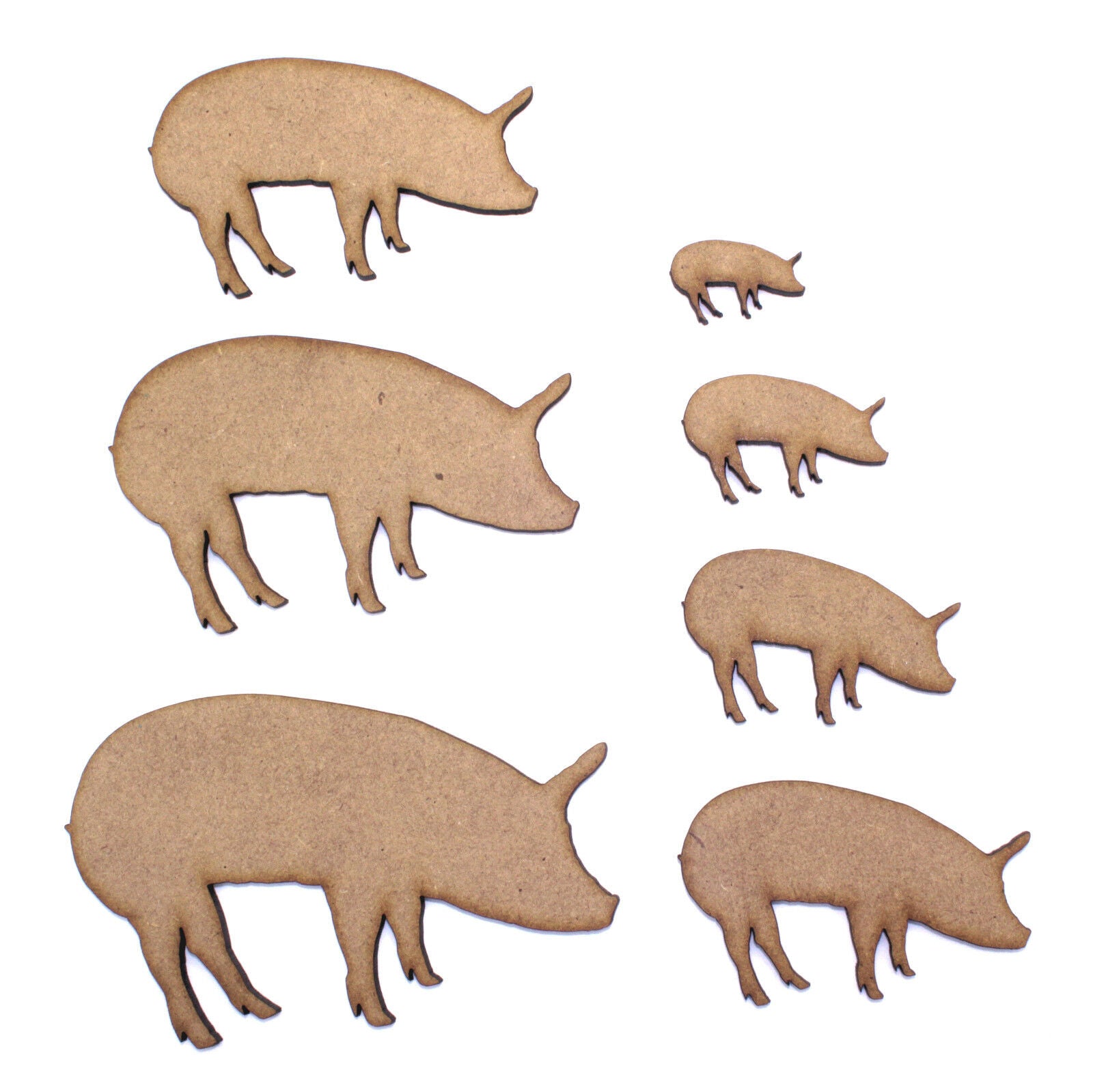 These 2mm thick MDF pig shapes are available in the following sizes: 20mm, 30mm, 40mm, 50mm, 60mm, 70mm, 80mm, 90mm, 100mm, 150mm, 200mm They are laser cut from premium 2mm thick MDF These embellishments can be used in craft projects, making decorations, gift tags, cards, decoupage etc. They would be perfect for creating wedding or anniversary cards, gifts and decorations. They can be painted and glued into place (some light roughing of the surface with sandpaper may be required depending on medium being used). Being laser cut, they do have some small laser burn marks, though these can be painted over or sanded out if required.