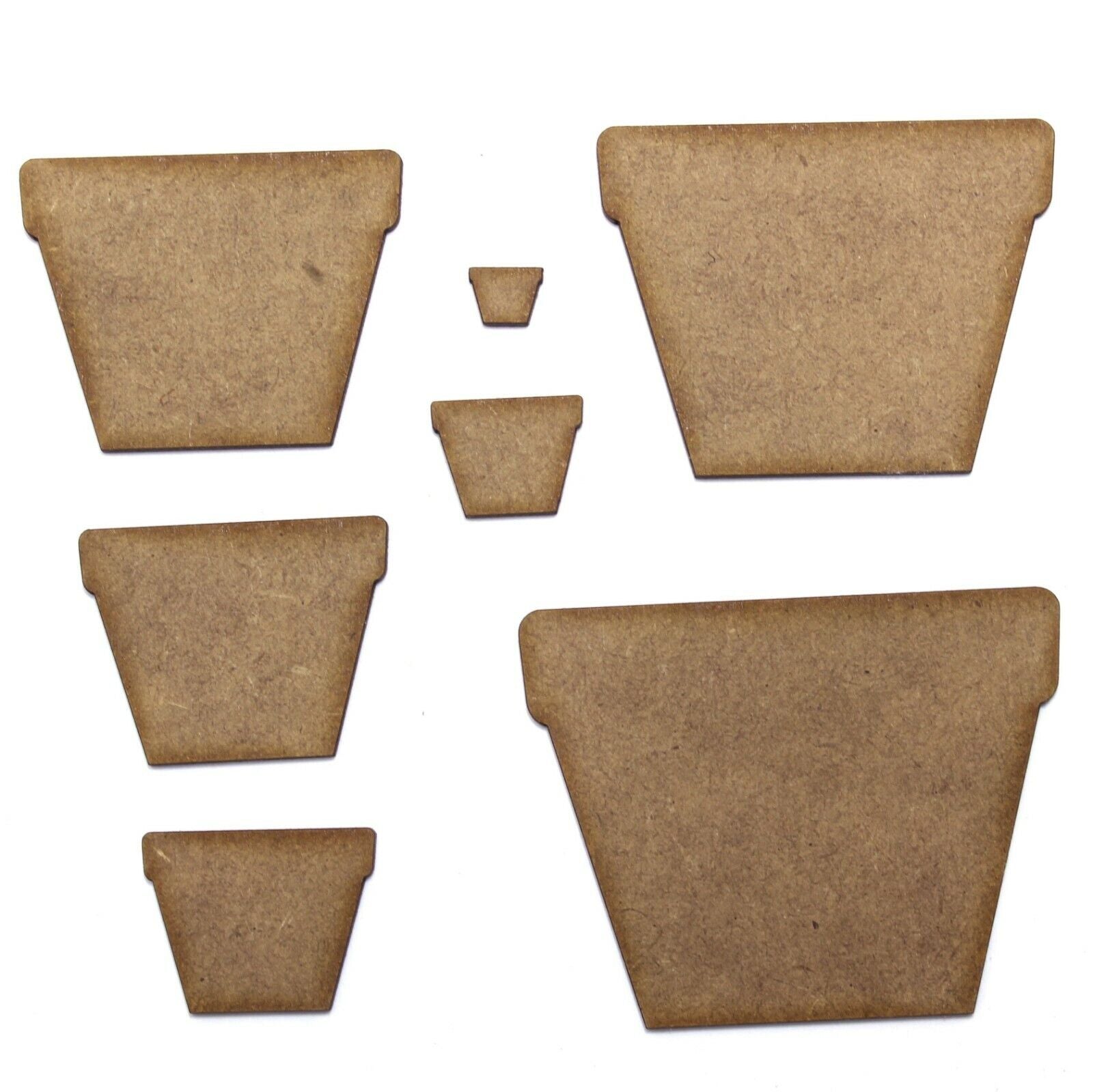 These 2mm thick MDF plant pot shapes are available in the following sizes: 10mm, 20mm, 30mm, 40mm, 50mm, 60mm, 70mm, 80mm, 90mm, 100mm, 150mm, 200mm They are laser cut from premium 2mm thick MDF These embellishments can be used in craft projects, making decorations, gift tags, cards, decoupage etc. They would be perfect for creating wedding or anniversary cards, gifts and decorations. They can be painted and glued into place (some light roughing of the surface with sandpaper may be required depending on medium being used). Being laser cut, they do have some small laser burn marks, though these can be painted over or sanded out if required. 10mm x 7mm 20mm x 15mm 30mm x 23mm 40mm x 31mm 50mm x 38mm 60mm x 46mm 70mm x 54mm 80mm x 62mm 90mm x 70mm 100mm x 77mm 150mm x 116mm 200mm x 155mm