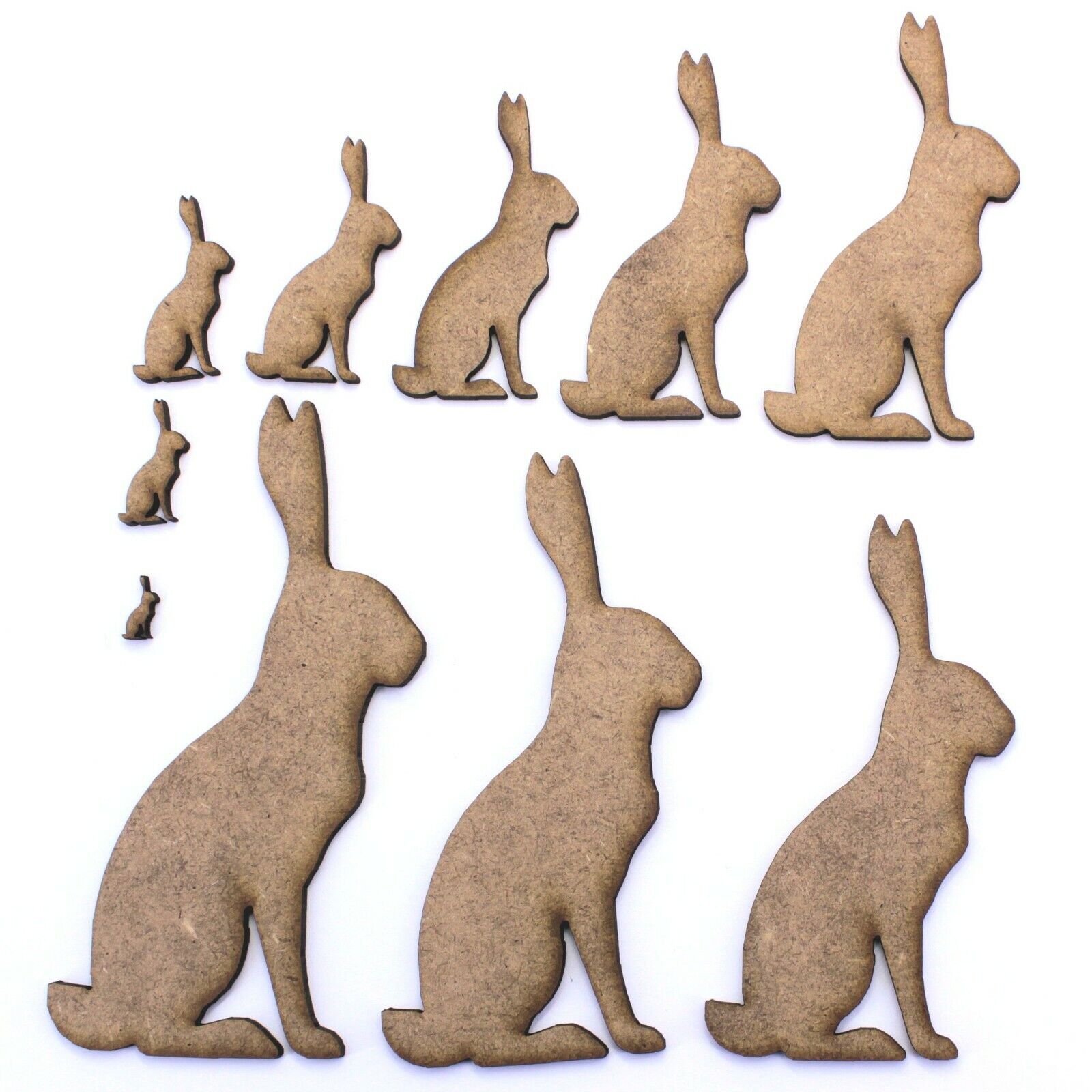 These 2mm thick MDF sitting rabbits / hares are available in the following sizes: 10mm, 20mm, 30mm, 40mm, 50mm, 60mm, 70mm, 80mm, 90mm, 100mm They are laser cut from premium 2mm thick MDF These embellishments can be used in craft projects, making decorations, gift tags, cards, decoupage etc. They can be painted and glued into place (some light roughing of the surface with sandpaper may be required depending on medium being used). Being laser cut, they do have some small laser burn marks, though these can be painted over or sanded out if required.