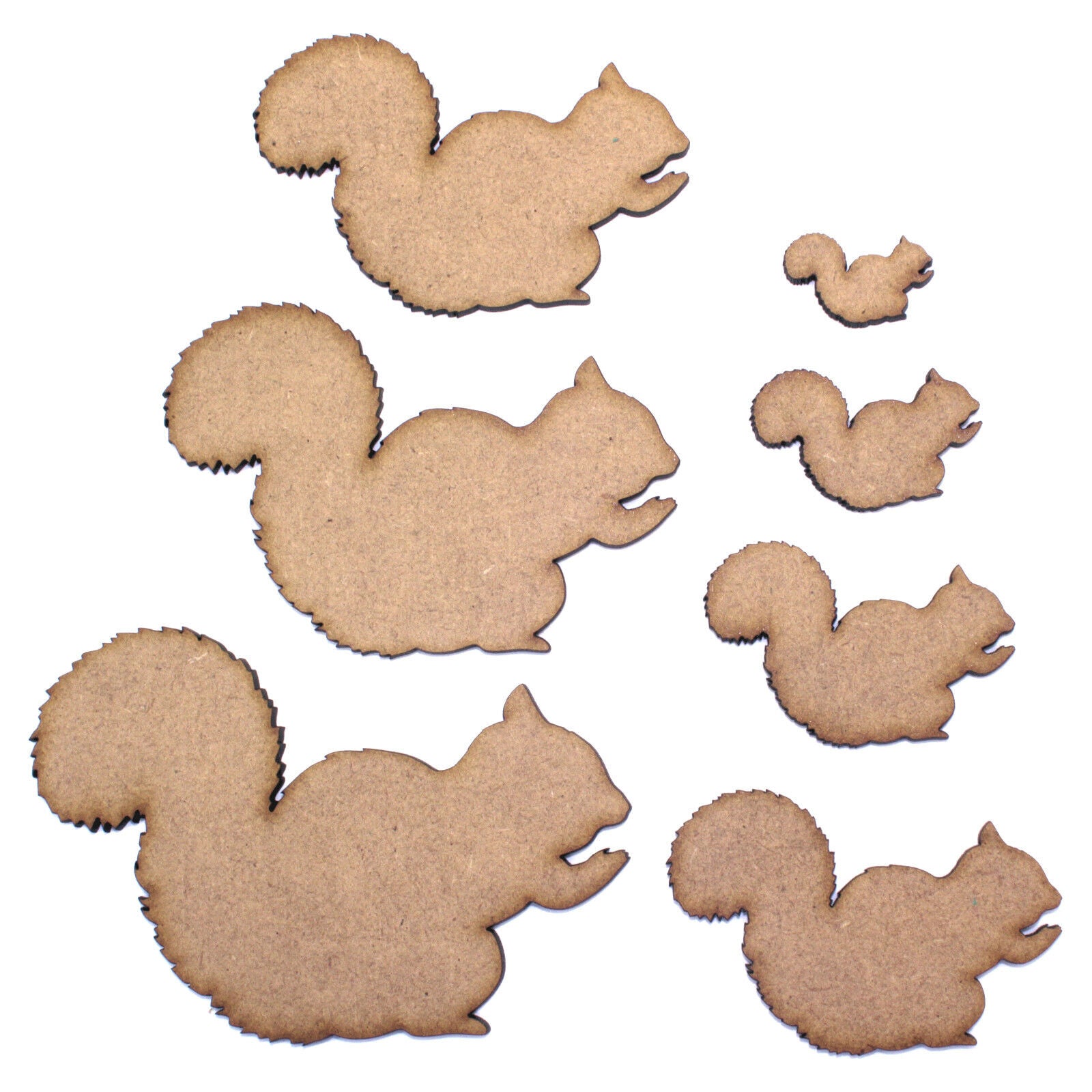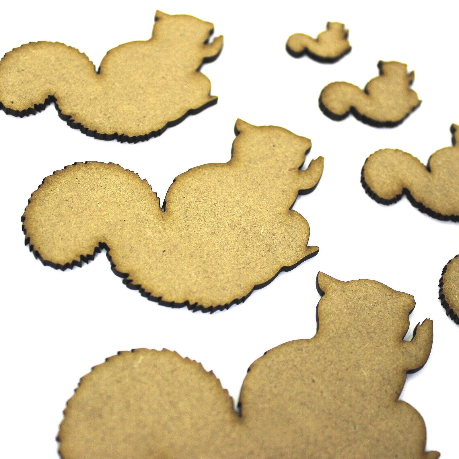 These 2mm thick MDF squirrel shapes are available in the following sizes: 20mm, 30mm, 40mm, 50mm, 60mm, 70mm, 80mm, 90mm, 100mm, 150mm, 200mm They are laser cut from premium 2mm thick MDF These embellishments can be used in craft projects, making decorations, gift tags, cards, decoupage etc. They would be perfect for creating wedding or anniversary cards, gifts and decorations. They can be painted and glued into place (some light roughing of the surface with sandpaper may be required depending on medium being used). Being laser cut, they do have some small laser burn marks, though these can be painted over or sanded out if required.