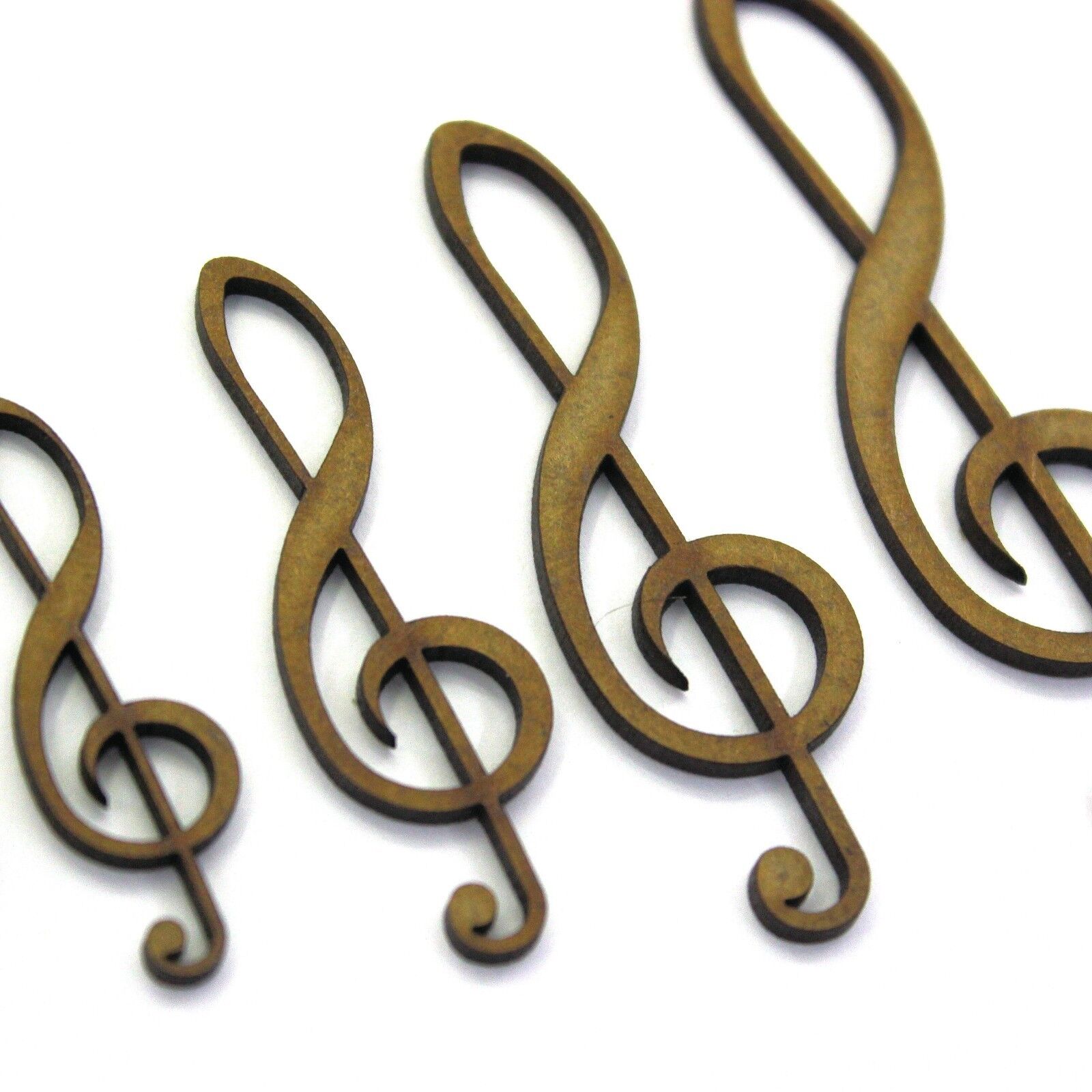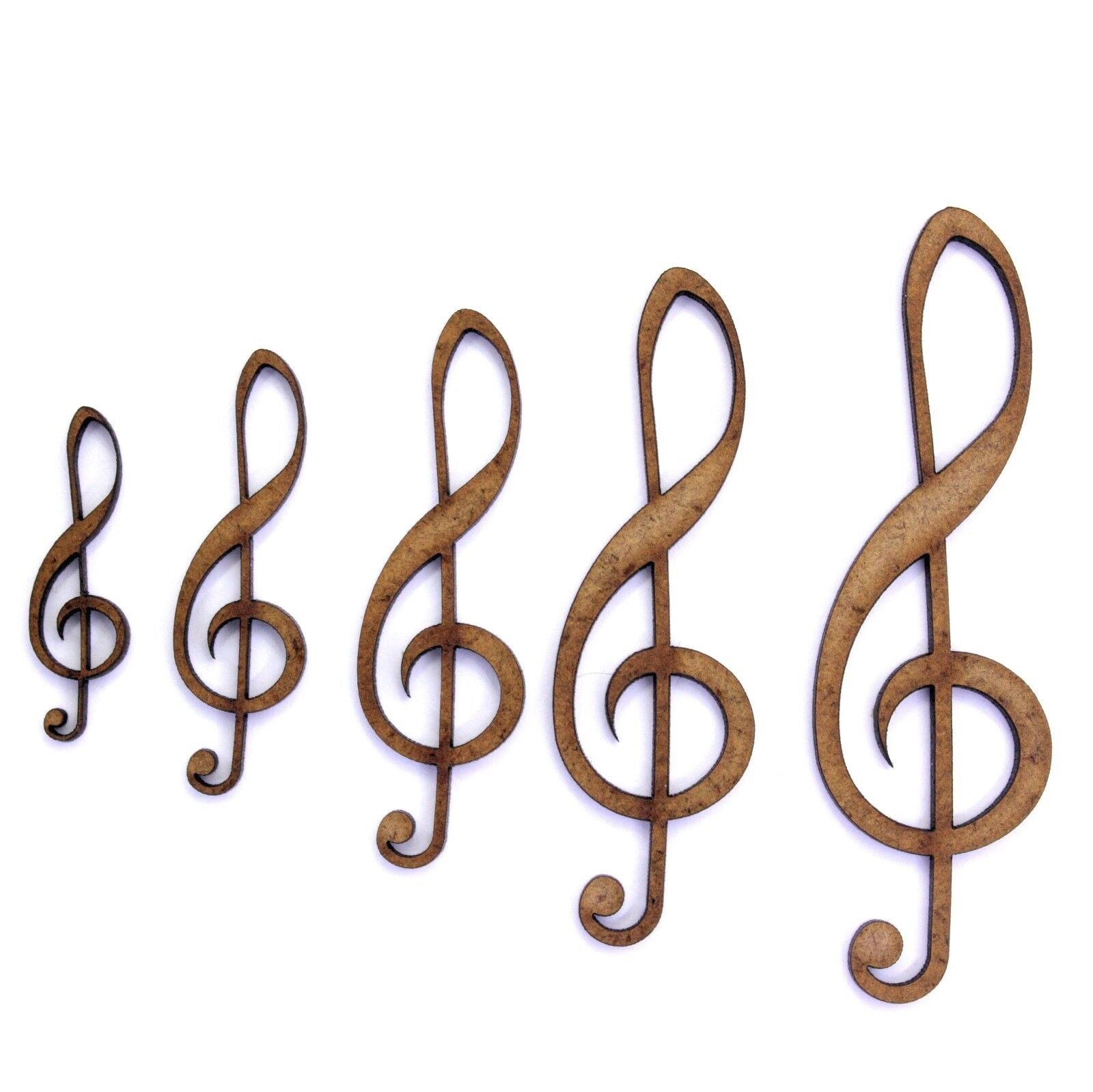 These 2mm thick MDF treble clef shapes are available in the following sizes: 30mm, 40mm, 50mm, 60mm, 70mm, 80mm, 90mm, 100mm, 150mm, 200mm They are laser cut from premium 2mm thick MDF These embellishments can be used in craft projects, making decorations, gift tags, cards, decoupage etc. They would be perfect for creating wedding or anniversary cards, gifts and decorations. They can be painted and glued into place (some light roughing of the surface with sandpaper may be required depending on medium being used). Being laser cut, they do have some small laser burn marks, though these can be painted over or sanded out if required.