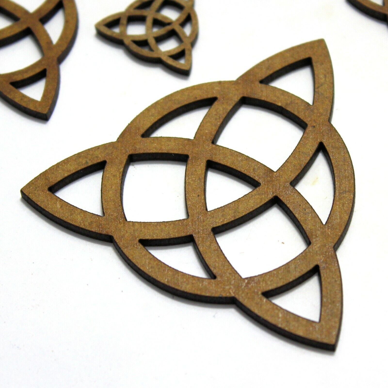 These 2mm thick MDF triquetra symbol shapes are available in the following sizes: 20mm, 30mm, 40mm, 50mm, 60mm, 70mm, 80mm, 90mm, 100mm, 150mm, 200mm They are laser cut from premium 2mm thick MDF These embellishments can be used in craft projects, making decorations, gift tags, cards, decoupage etc. They would be perfect for creating wedding or anniversary cards, gifts and decorations. They can be painted and glued into place (some light roughing of the surface with sandpaper may be required depending on medium being used). Being laser cut, they do have some small laser burn marks, though these can be painted over or sanded out if required.