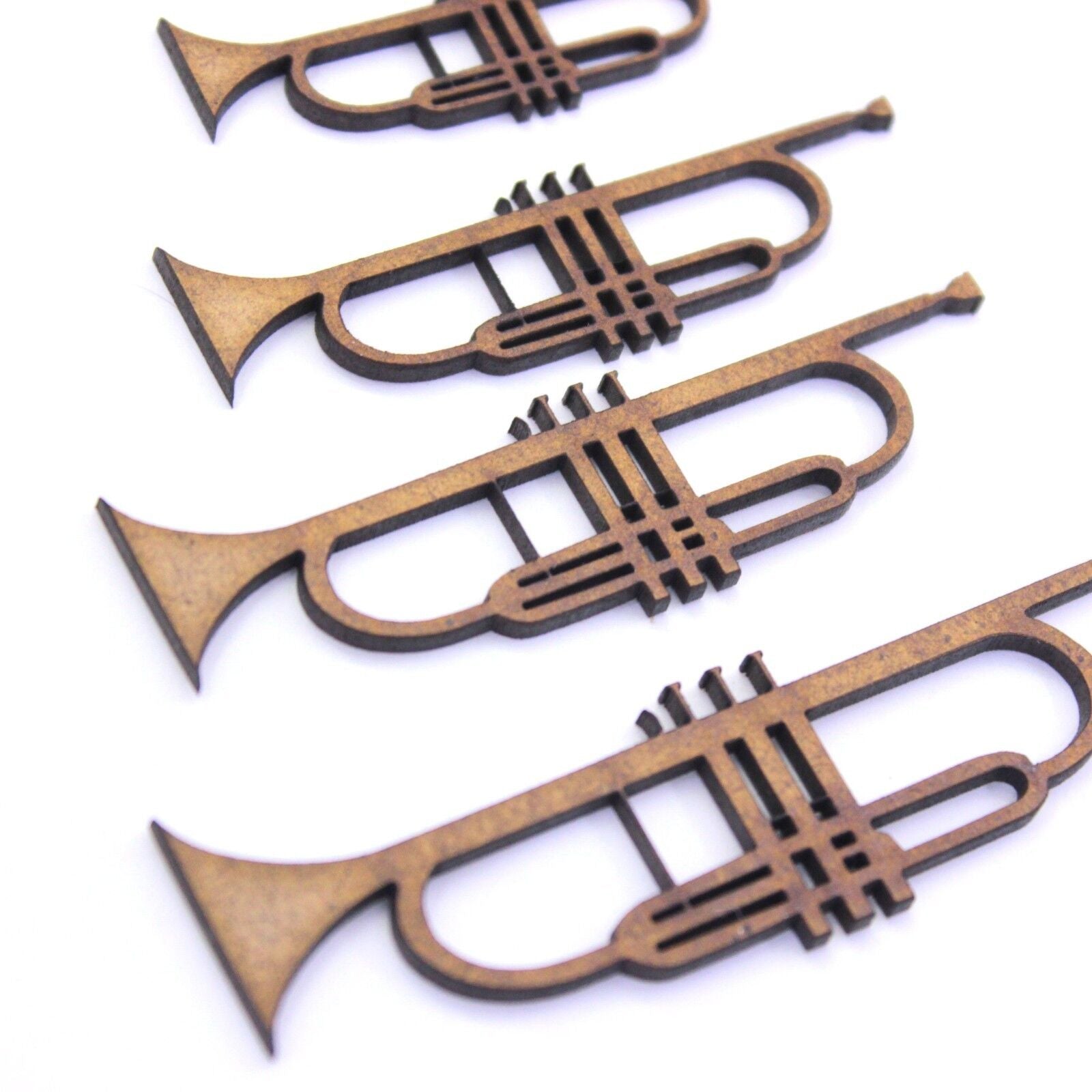 These 2mm thick MDF trumpet shapes are available in the following sizes: 50mm, 60mm, 70mm, 80mm, 90mm, 100mm, 150mm, 200mm They are laser cut from premium 2mm thick MDF These embellishments can be used in craft projects, making decorations, gift tags, cards, decoupage etc. They would be perfect for creating wedding or anniversary cards, gifts and decorations. They can be painted and glued into place (some light roughing of the surface with sandpaper may be required depending on medium being used). Being laser cut, they do have some small laser burn marks, though these can be painted over or sanded out if required.