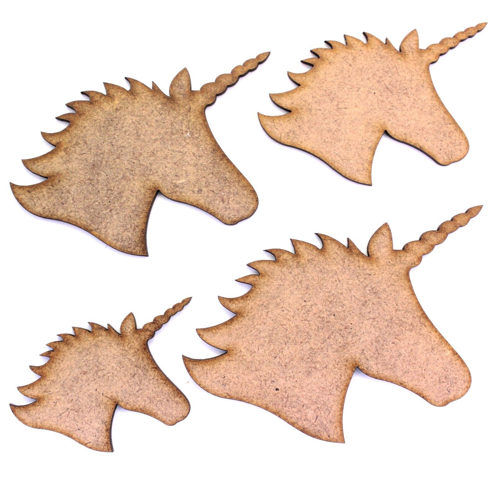 These 2mm thick MDF unicorn head shapes are available in the following sizes: 50mm, 60mm, 70mm, 80mm, 90mm, 100mm, 150mm, 200mm They are laser cut from premium 2mm thick MDF These embellishments can be used in craft projects, making decorations, gift tags, cards, decoupage etc. They would be perfect for creating birthday, wedding or anniversary cards, gifts and decorations. They can be painted and glued into place (some light roughing of the surface with sandpaper may be required depending on medium being used). Being laser cut, they do have some small laser burn marks, though these can be painted over or sanded out if required.