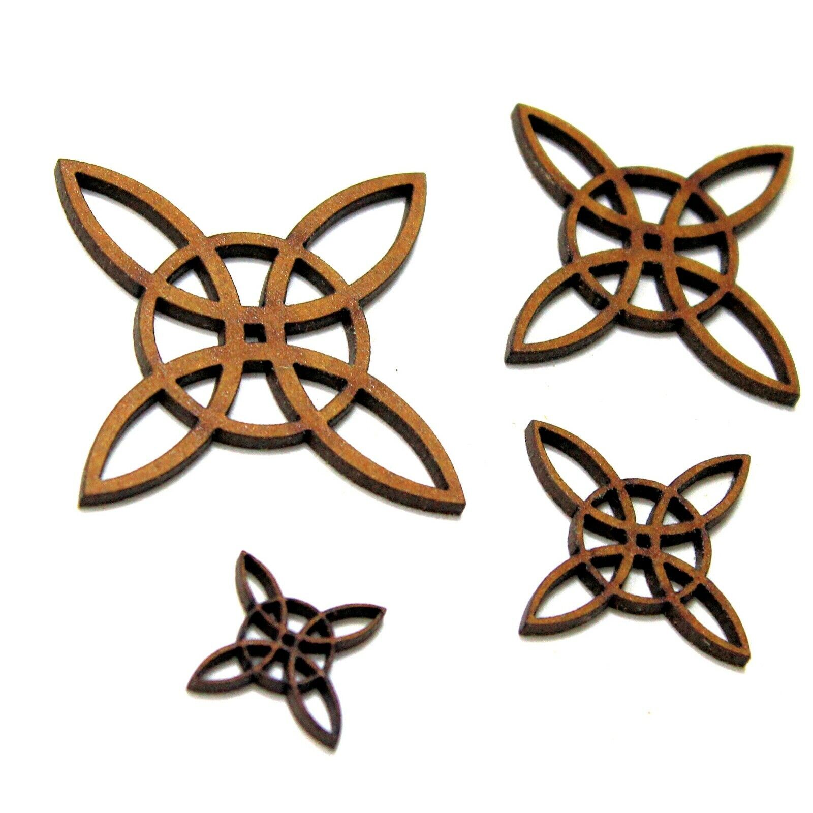 These 2mm thick MDF Wiccan Witch's Knot shapes are available in the following sizes: 20mm, 30mm, 40mm, 50mm, 60mm, 70mm, 80mm, 90mm, 100mm, 150mm, 200mm They are laser cut from premium 2mm thick MDF These embellishments can be used in craft projects, making decorations, gift tags, cards, decoupage etc. They would be perfect for creating wedding or anniversary cards, gifts and decorations. They can be painted and glued into place (some light roughing of the surface with sandpaper may be required depending on medium being used). Being laser cut, they do have some small laser burn marks, though these can be painted over or sanded out if required.